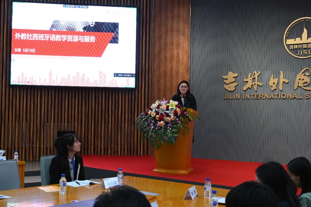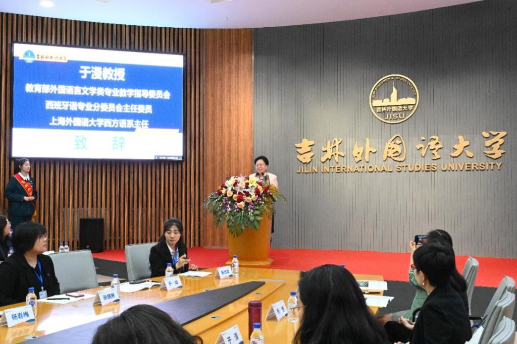 主旨报告由西方语学院西班牙语系主任于淼主持。于漫教授以《AI技术赋能西班牙语的教与学》为题,聚焦AI技术在西班牙语教学领域的前沿技术方法和典型技术应用。随后,天津外国语大学张鹏教授、北京外国语大学李紫莹教授、上海外国语大学曹羽菲教授和上海外语教育出版社许一飞副编审依次发言,针对西班牙语教学、科研、翻译以及教学资源服务等分享研究成果。结合报告内容,与会人员进行了深入交流和热烈讨论。