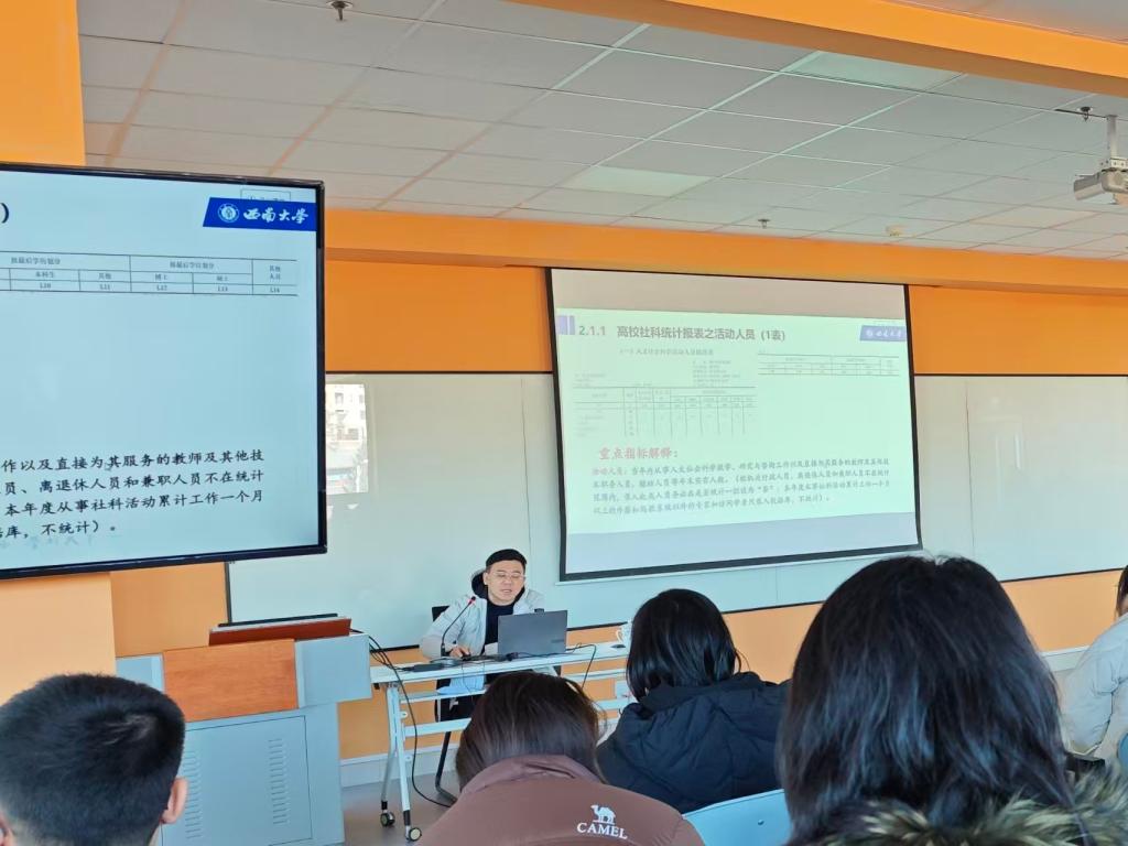 本次培训聚焦统计工作核心需求,特邀教育部科技统计培训专家蔡琳、王乐元分别主讲科技与社科统计专题。蔡琳专家围绕全国普通高校科技统计指标体系展开深度解读,结合最新政策要求,对科研项目、经费投入、成果转化等关键指标的界定标准与统计口径进行逐一说明,并通过案例演示讲解了科技统计系统的操作流程与数据核查要点。王乐元专家则针对社科云统计平台的使用规范、社科统计年报填写中的常见问题及解决方案进行系统授课,重点解析了学术成果、社会服务等统计模块的填报技巧。